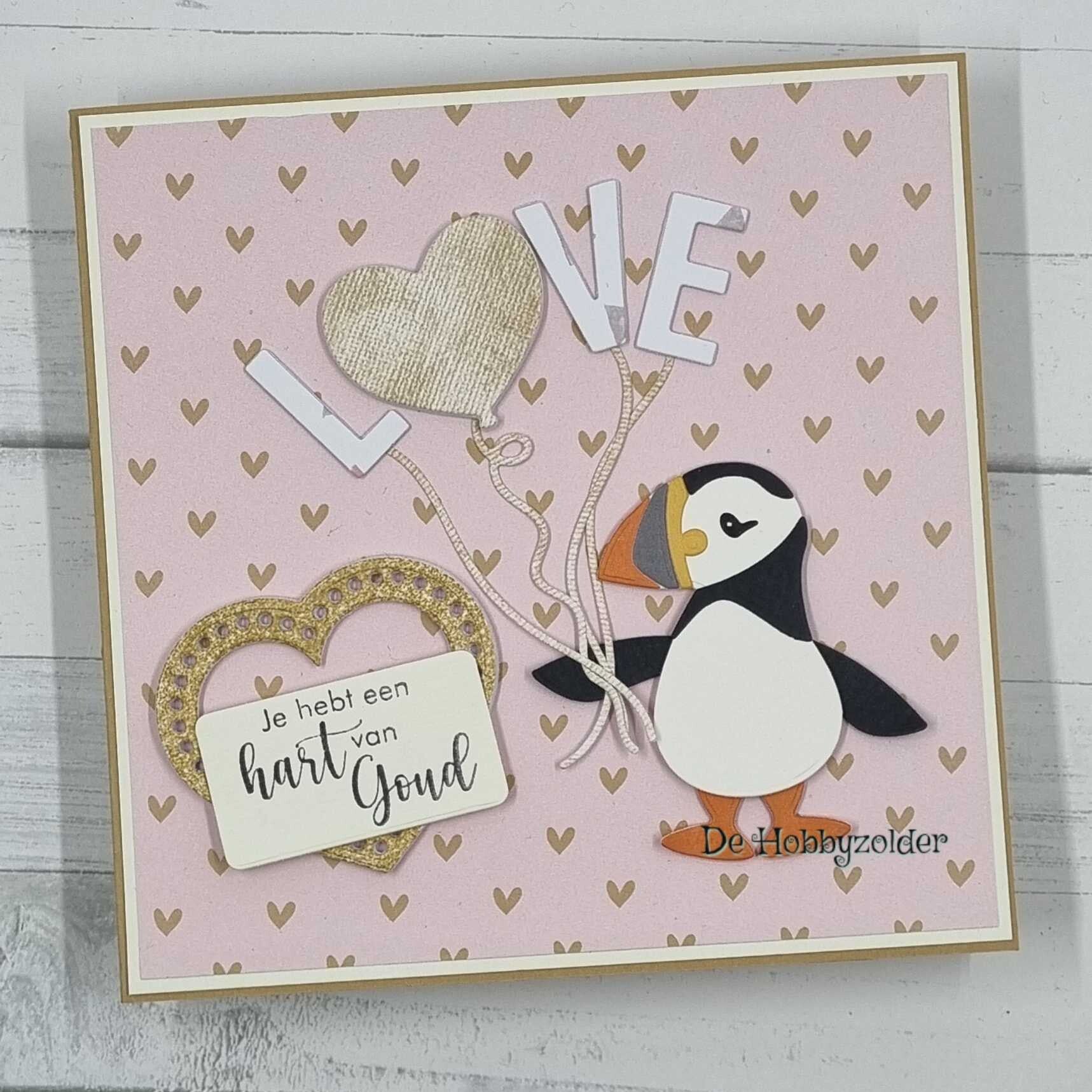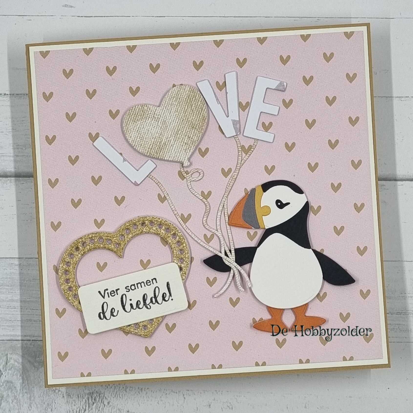Vierkante kaart met een achtergrond van hartjes en een papegaaiduiker die ballonnen vast houdt met de letters Love